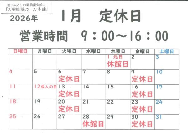 HOME > トピックス > トピックス お知らせ 物産会館内「三条金物~越乃一刀~」令和8年1月定休日 2025年12月23日 物産会館内「三条金物~越乃一刀~」令和8年1月定休日のお知らせ 新潟・燕三条の刃物(登録商標 越乃一刀)を中心に金物、雑貨各種取り揃えてございます。 物産会館内 営業時間 9:00~16:00(通年) ※時間・定休日は状況により変更になる場合がございます。 お出掛け前に下記ページをご覧いただくか、お電話にてご確認ください。 朝日みどりの里ホームページ 営業日カレンダー 【お問い合わせ先】0254-72-1551(代表) ほんわ館&オンラインショップバナー Twitter Share Pocket Hatena LINE コピーする