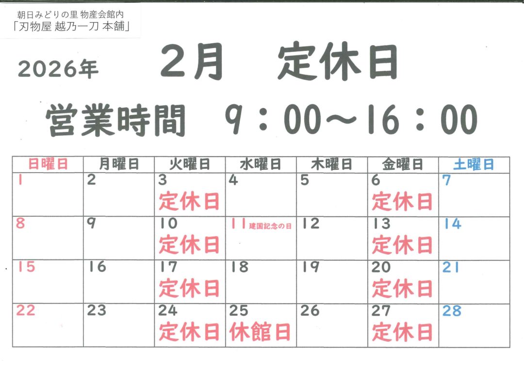 HOME > トピックス > トピックス お知らせ 物産会館内「三条金物~越乃一刀~」令和8年2月定休日 2026年1月17日 物産会館内「三条金物~越乃一刀~」令和8年2月定休日のお知らせ 新潟・燕三条の刃物(登録商標 越乃一刀)を中心に金物、雑貨各種取り揃えてございます。 物産会館内 営業時間 9:00~16:00(通年) ※時間・定休日は状況により変更になる場合がございます。 お出掛け前に下記ページをご覧いただくか、お電話にてご確認ください。 朝日みどりの里ホームページ 営業日カレンダー 【お問い合わせ先】0254-72-1551(代表) ほんわ館&オンラインショップバナー Twitter Share Pocket Hatena LINE コピーする