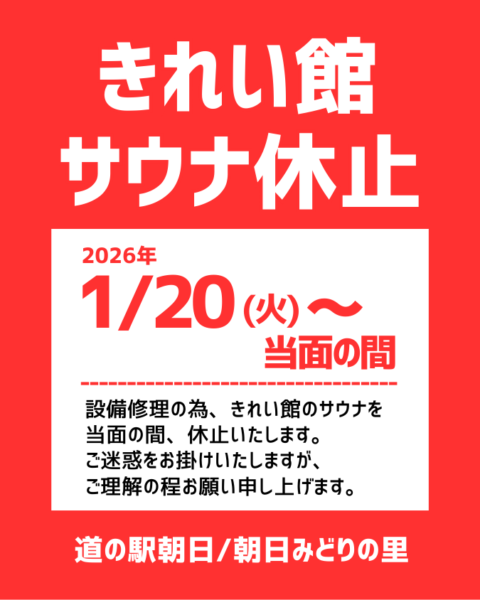 HOME > トピックス > トピックス お知らせ 【朝日きれい館】サウナ休止のお知らせ(2026/1/20) 2026年1月20日 朝日きれい館より サウナ休止のお知らせ 本日、 令和8年1/20(火)~当面の間 朝日きれい館のサウナを休止いたします。 きれい館内、サウナ以外は 通常通りご利用いただけます。 再開の目途がつきましたら またお知らせいたします。 大変ご迷惑をお掛けいたしますが、 ご理解の程お願い申し上げます。 ほんわ館&オンラインショップバナー Twitter Share Pocket Hatena LINE コピーする