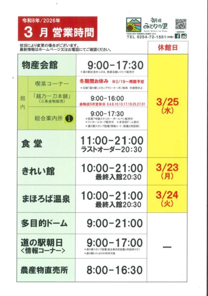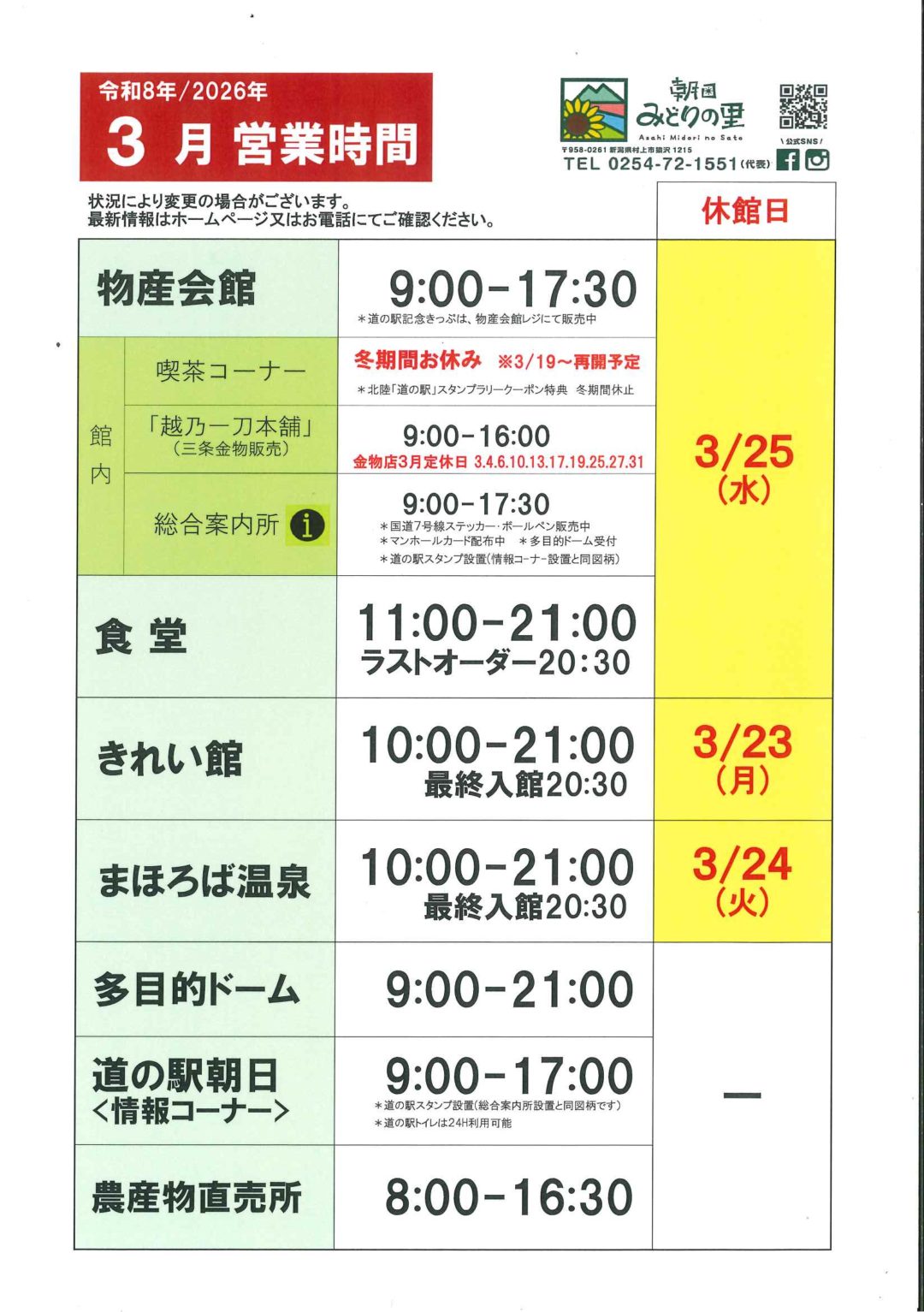 【朝日みどりの里 令和8年3月営業時間/休館日】