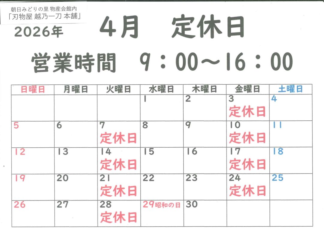 HOME > トピックス > トピックス お知らせ 物産会館内「三条金物~越乃一刀~」令和8年4月定休日 2026年4月1日 物産会館内「三条金物~越乃一刀~」令和8年4月定休日のお知らせ 新潟・燕三条の刃物(登録商標 越乃一刀)を中心に金物、雑貨各種取り揃えてございます。 物産会館内 営業時間 9:00~16:00(通年) ※時間・定休日は状況により変更になる場合がございます。 お出掛け前に下記ページをご覧いただくか、お電話にてご確認ください。 朝日みどりの里ホームページ 営業日カレンダー 【お問い合わせ先】0254-72-1551(代表) ほんわ館&オンラインショップバナー Twitter Share Pocket Hatena LINE コピーする
